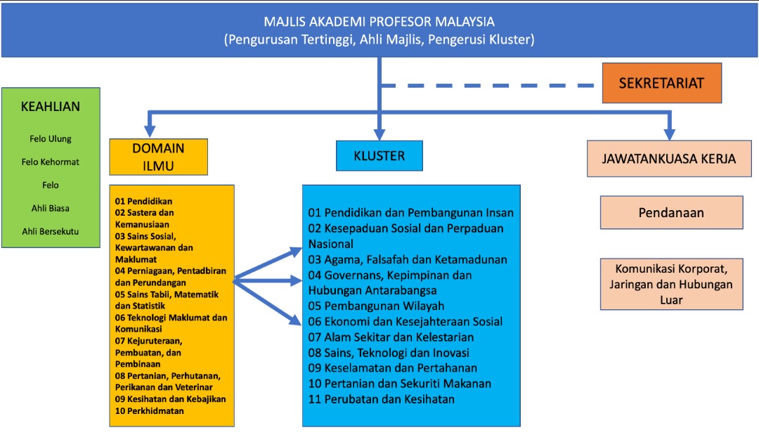The structure of the Academy of Professors is shown in the Figure below. The leadership of the Academy of Professors will be guided by the Council of the Academy of Professors Malaysia. Under this Council there are nine clusters and fourteen domains of knowledge. Each domain of knowledge will incorporate academics in the related knowledge and be headed by a Head of Domain.